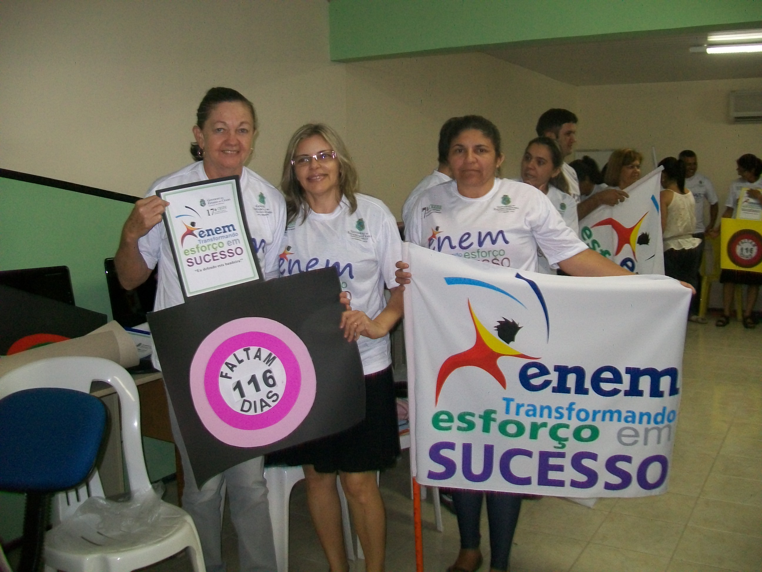 Na ocasião, cada gestor recebeu um kit “ENEM TRANSFORMANDO ESFORÇO EM SUCESSO” contendo: 01 camisa, 01 bandeira e 01 alvo com a contagem regressiva para o dia do enem. Foi acordado, entre os participantes, que cada núcleo gestor faria um momento especial, para fincar a bandeira na entrada da escola, bem como o Alvo nas salas do 3º ano, com o objetivo de sensibilizar e mobilizar à todos, quanto a importância do Exame Nacional Do Ensino Medio – ENEM. Houve ainda uma socialização e condensação dos Planos de Ação, que deverão ser desenvolvidos em cada Unidade Escolar, até o dia da matrícula no SISU e permanente acompanhamento.