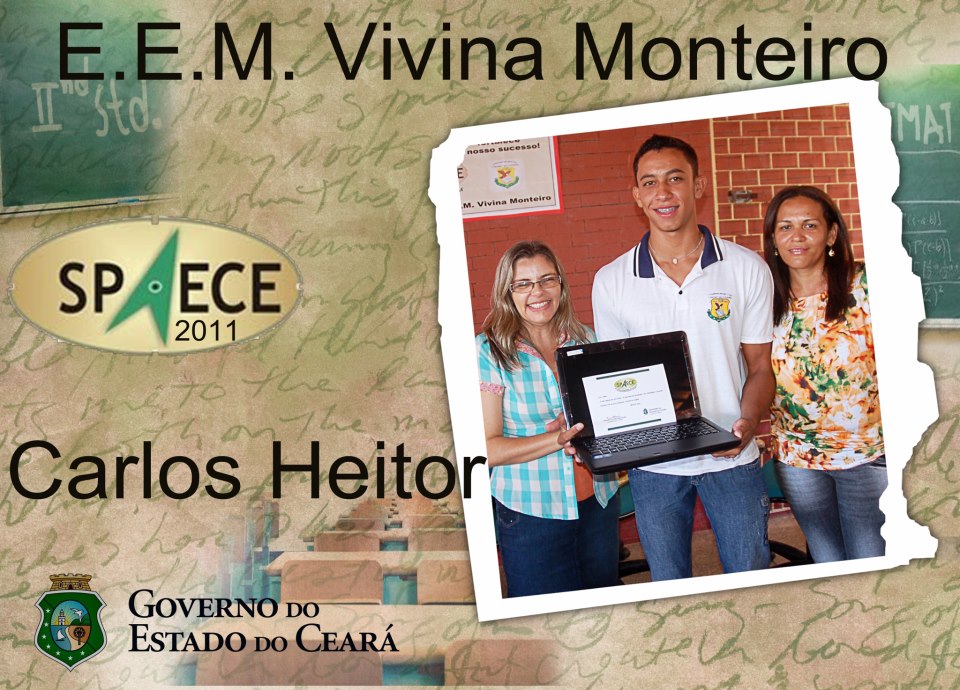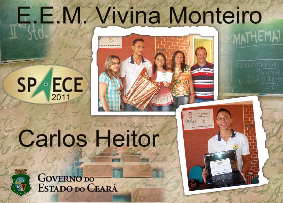 Eu, na ocasião de professor, gostaria de Parabenizar ao Aluno Carlos Heitor por mais esta conquista, e incentivar os outros alunos a fazerem uma boa prova do SPAECE 2012, para que no próximo ano, estejam também nesta solenidade de premiação.