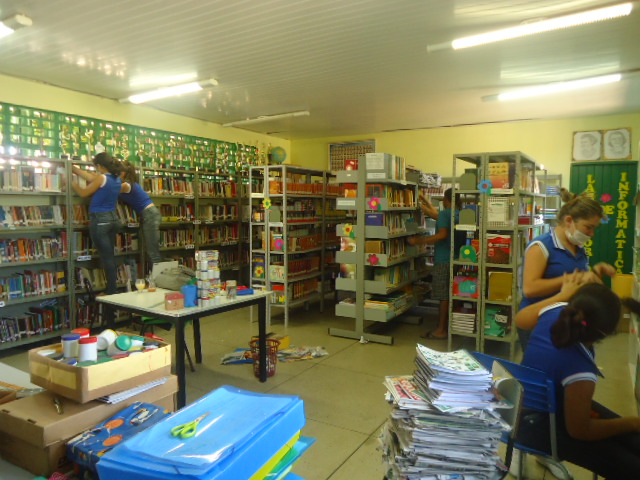 Higienização de ambientes, Manutenção e limpeza de computadores, ventiladores, substituição de lâmpadas; Organização e identificação de armários e estantes; Organização de quadro de avisos; Identificação do acervo bibliográfico.