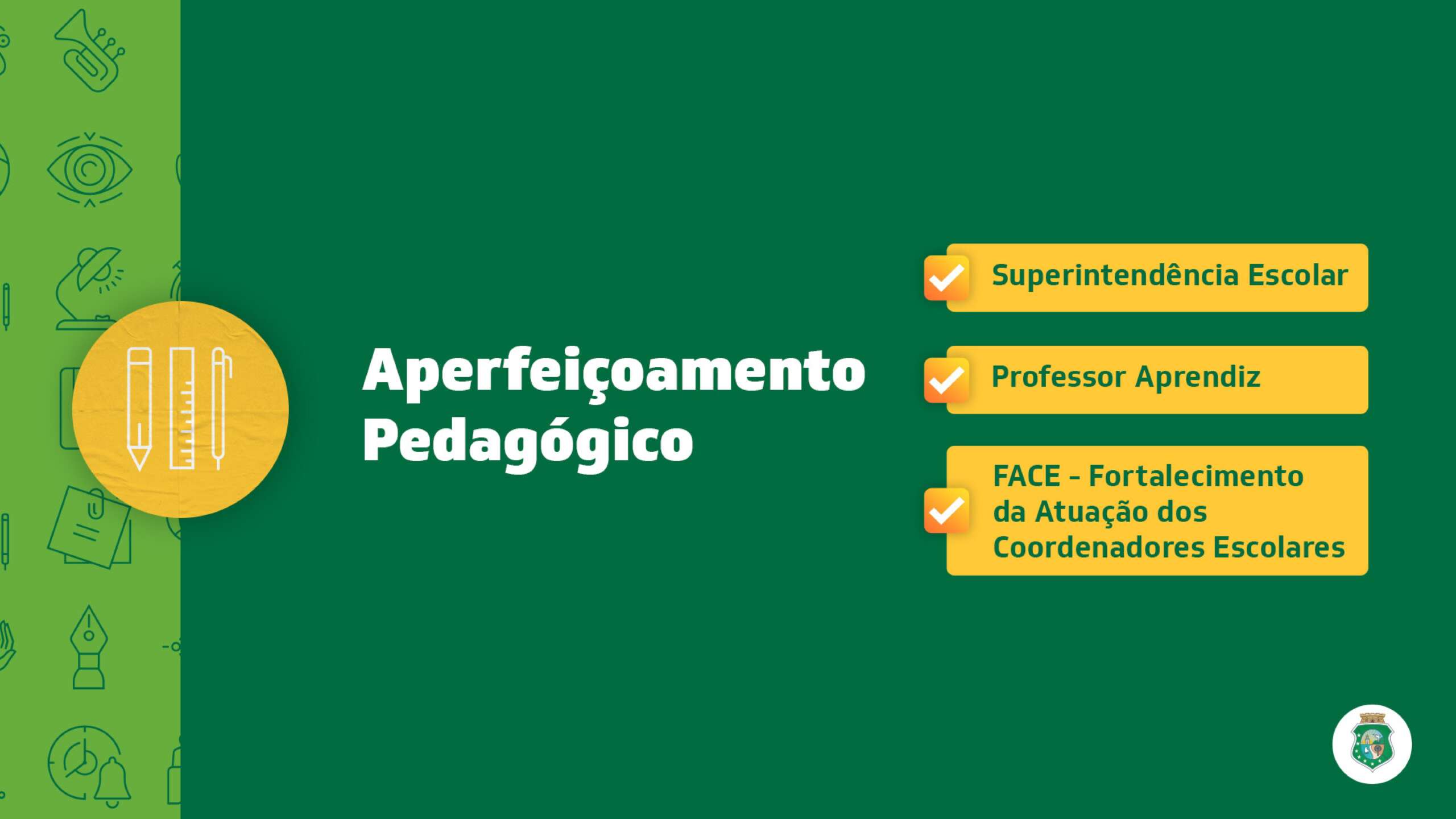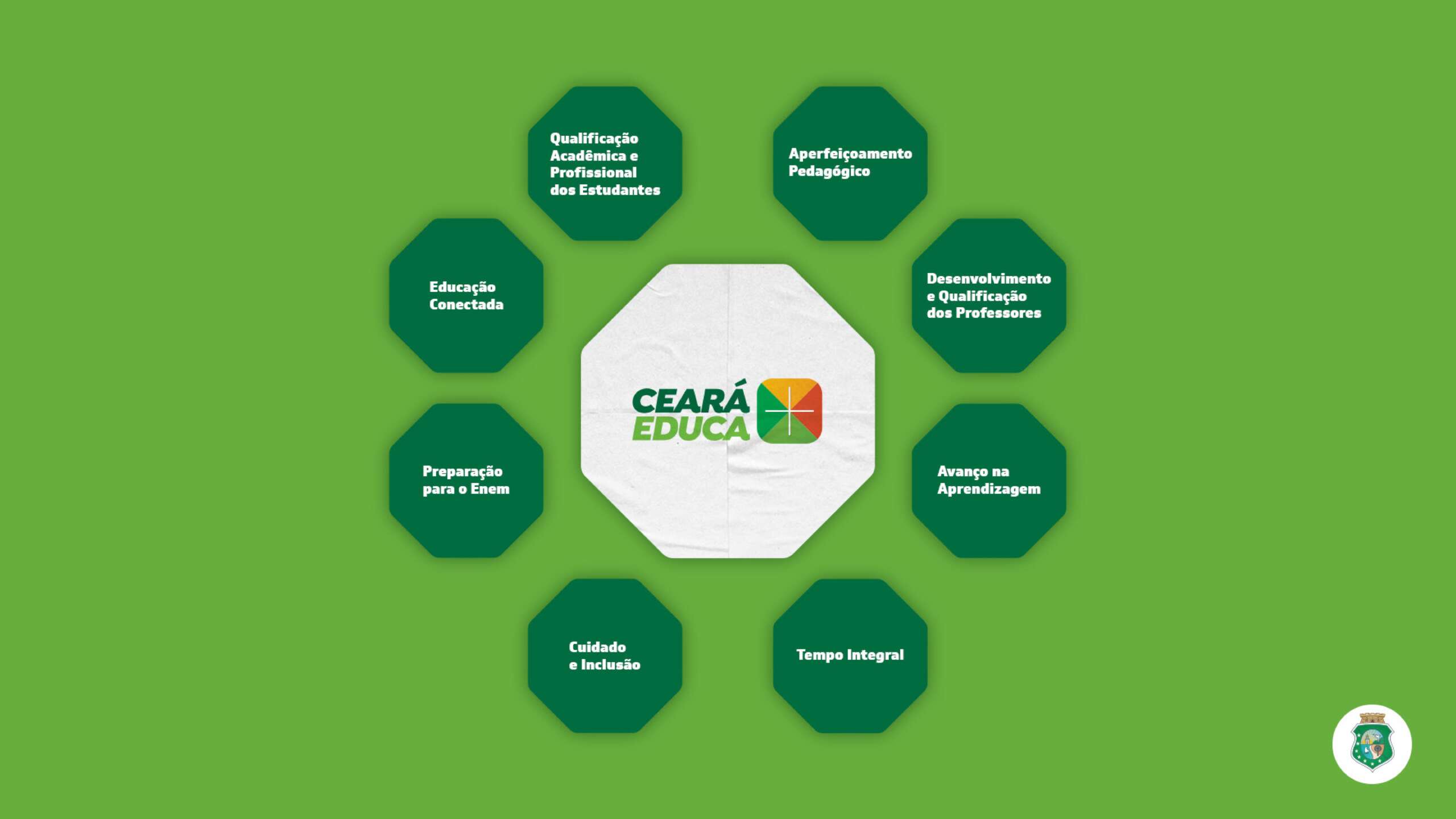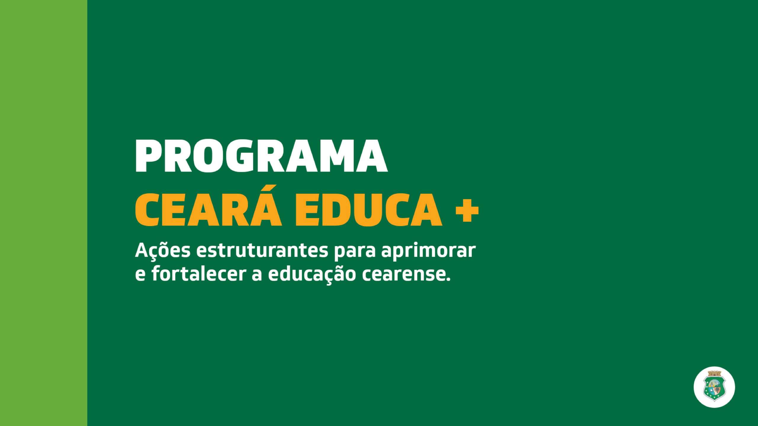 Todo o trabalho planejado e desenvolvido pela Secretaria da Educação integra o Programa Ceará Educa Mais, constituído de 25 ações destinadas à progressiva melhoria da qualidade da educação cearense. O programa, lançado em 2021, está fundamentado em oito eixos: Aperfeiçoamento pedagógico; Desenvolvimento e Qualificação dos Professores; Avanço na Aprendizagem; Tempo Integral; Cuidado e Inclusão; Preparação para o Enem; Educação Conectada; e Qualificação Acadêmica e Profissional dos Estudantes.